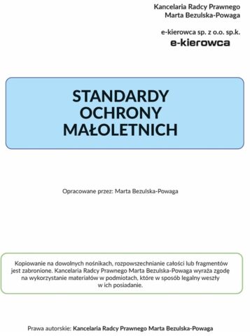 - Wersja skrócona Standardów ochrony małoletnich w wersji papierowej jest udostępniana opiekunom prawnym małoletnich przy zapisywaniu małoletniego na kurs nauki jazdy oraz małoletnim podczas pierwszych zajęć teoretycznych, w których małoletni weźmie udział.